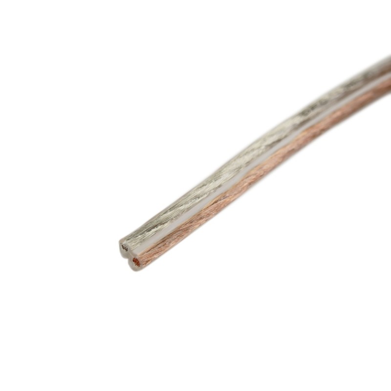 Bobina de cable de sonido profesional para conexión de altavoces con los equipos de sonido. Cable de prestaciones OFC (Oxigen Free Conductivity) o libre de oxígeno, de baja inductancia y capacidad. Cable transparente, muy flexible, polarizado de cobre y estañado. La sección del cable es de 5 (ancho) x 2.5 (alto) mm. La sección del conductor es de 2 x 0.75 mm. La composición es de 2c x 1 x 96 x 0.1. Bobina de 100m.